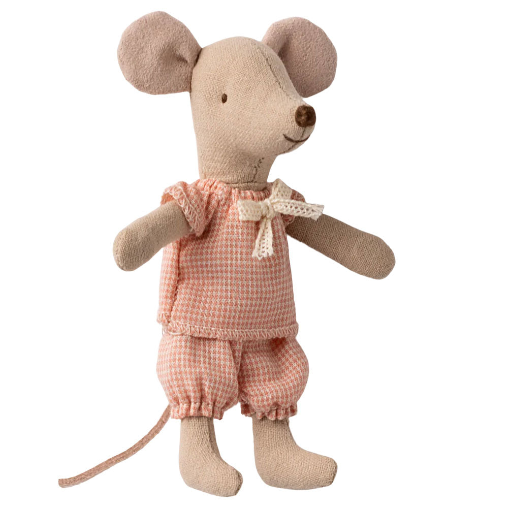A Maileg favourite, this Little Sister Mouse comes tucked inside her very own matchbox bed. Dressed in cosy pyjamas, she rests on a soft blanket with a little pillow, ready for sweet dreams. When she wakes, she is all set for hours of play before curling back up in her box at bedtime.