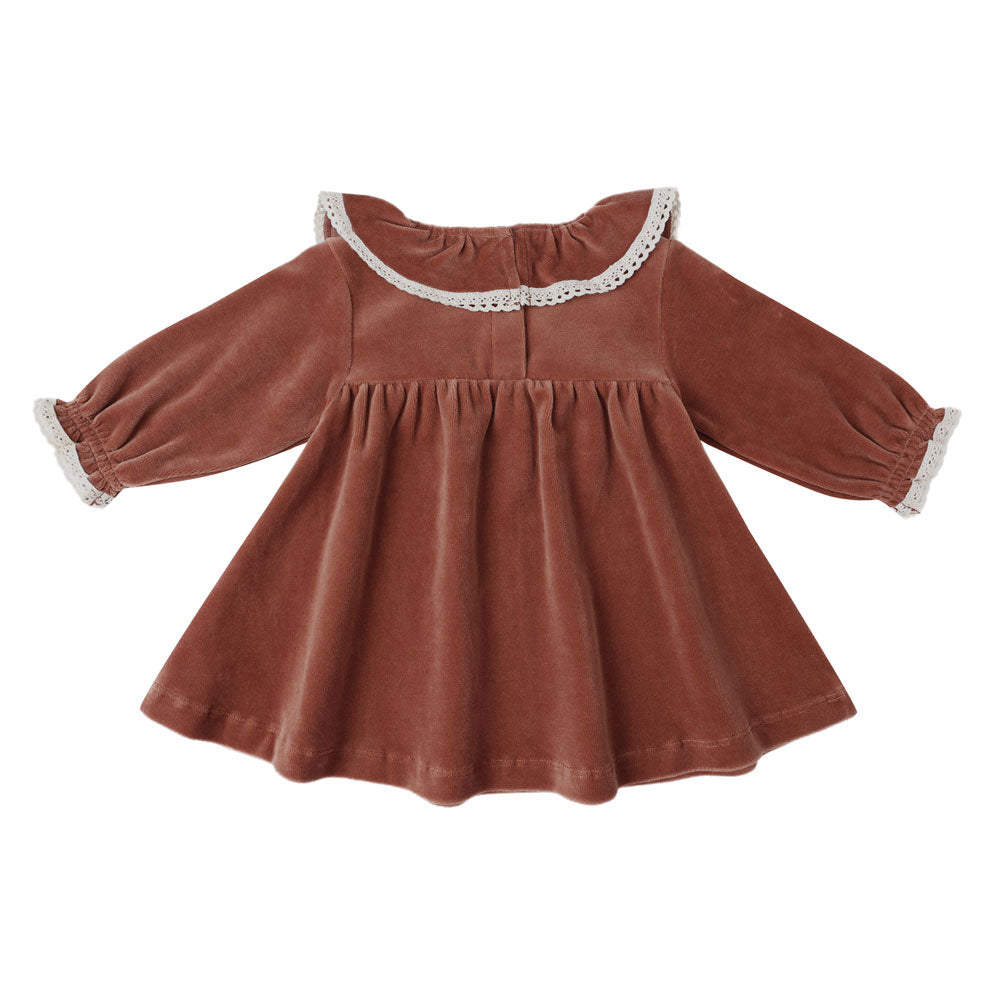 Our Velour Baby Dress features an empire waist dress with long sleeves and a cute ruffled collar.