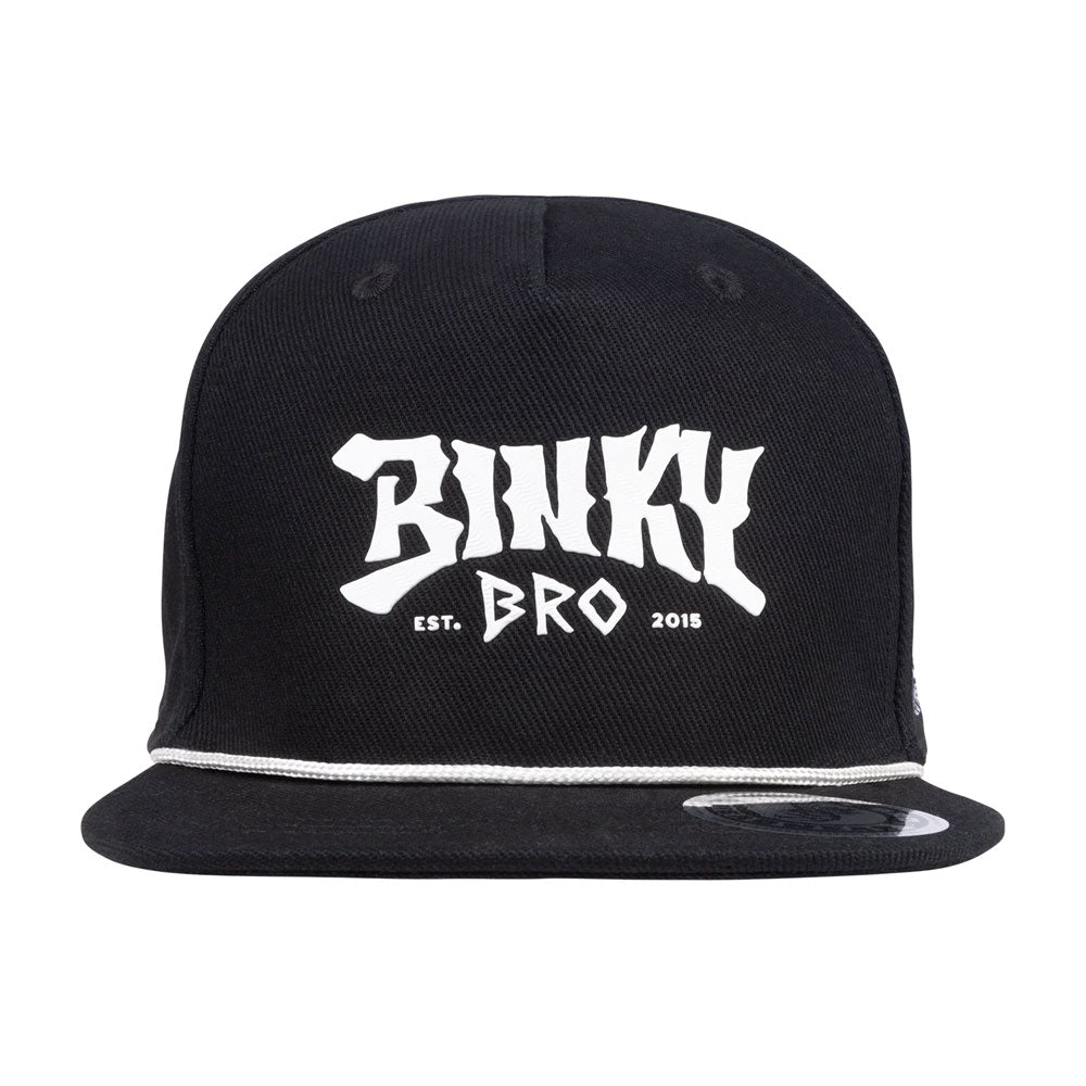 The Camden snapback hat has black panelling and features a branded "BinkyBro" embroidered logo. This hat is 100% cotton.