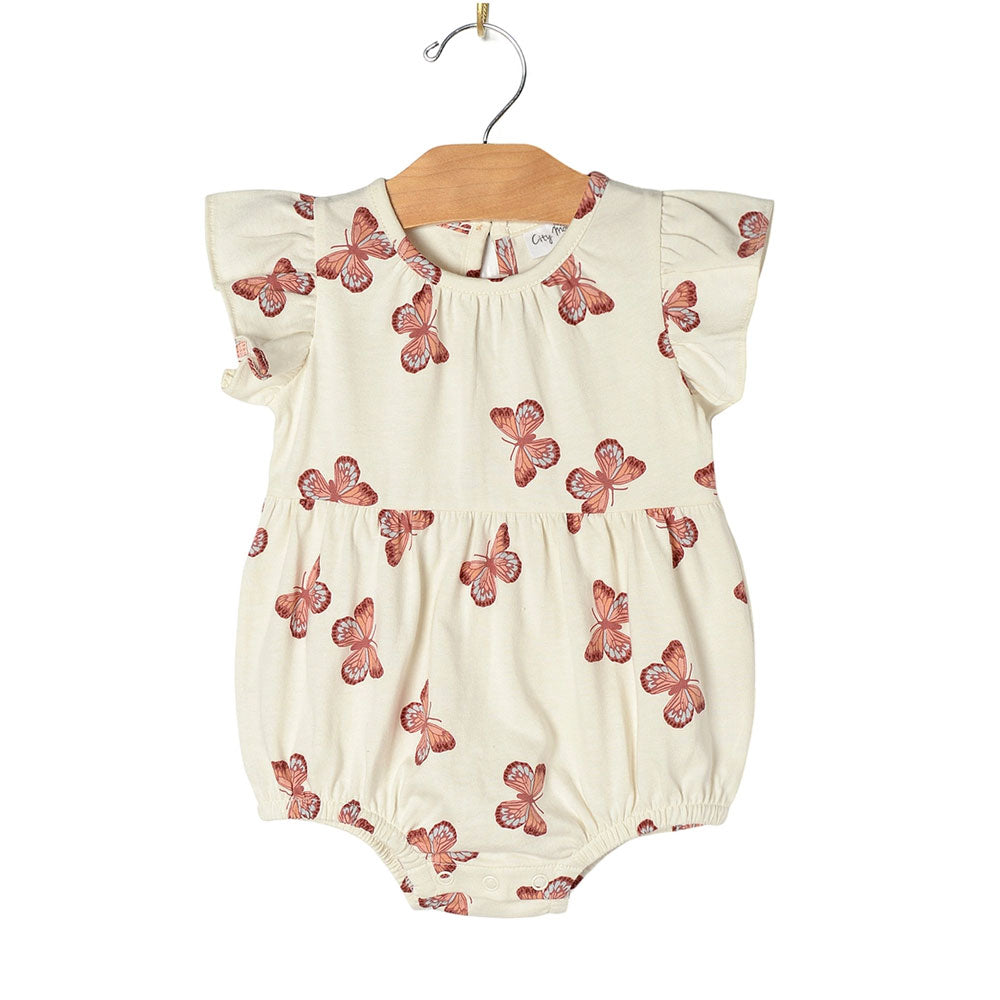 The new City Mouse Studios butterflies print in a favourite silhouette - flutter sleeves and a bubble waist make this both easy and stylish. Made from 100% cotton combed jersey and with snaps at the crotch for easy changing, it's perfect for spring adventures and events.