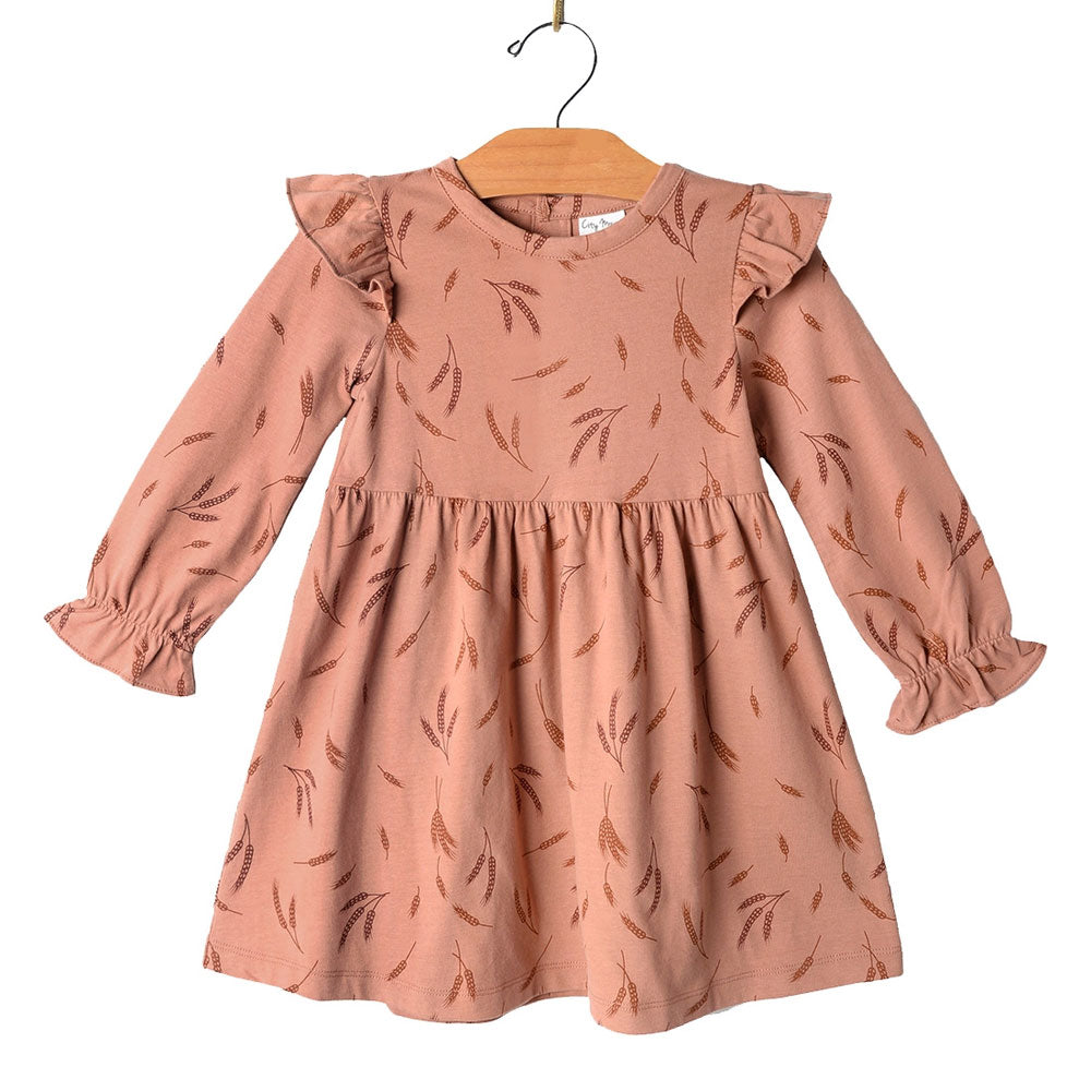 City Mouse's newest style is the flutter sleeve dress in 100% combed cotton jersey. The rusty fall harvest print and ruffle detailing make this an easy classic for all kinds of adventures to come.
