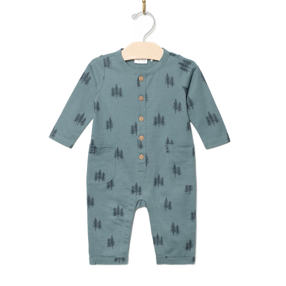 Made with the softest 100% combed cotton jersey. Featuring front buttons, side pockets for all their treasures, and leg snaps for easy changing. In City Mouse Studio's twilight forest print.