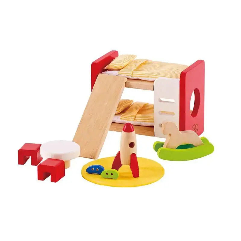 Every child wants a cool space to call their own. With the Children's Room Doll House Furniture Set from Hape, kids can decorate their doll's room with style. This innovatively designed furniture set features a bunk bed, a table and two chairs, and several toys, including rocket ship to keep doll children entertained. Fits perfectly into the Hape All Season Doll House, or any 1" doll house, and pairs well with Hape's other doll house furniture sets so little interior designers can mix and match furniture as they please.