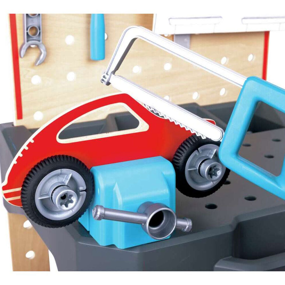 - PLENTY OF PIECES: This workbench includes a hammer, an electric drill, a saw, a bench screw, 2 gears, an L-square, a wrench, a screwdriver, a tape measure, 4 tires, 2 car bodies, a cardboard garage scene and some nuts and bolts.