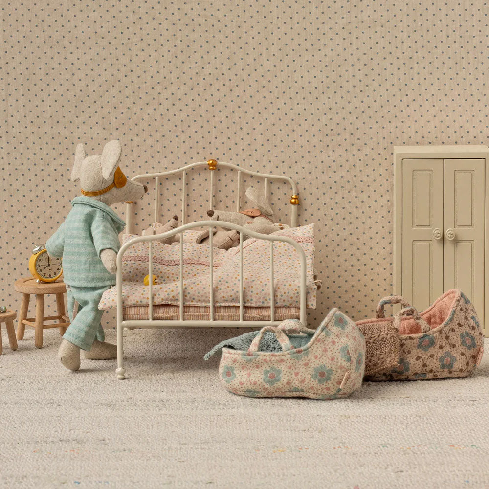 A perfect bed for a good nights sleep. The bedlinen is made in beautiful Maileg printed fabrics - all different but carefully chosen to make the look complete. This bed fits the mum/dad mice and grandmum/-dad mice.
