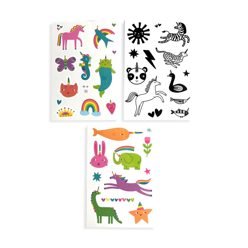 Happy was just made wearable with these unicorn party tattoo sheets. Durable and long lasting, these charming temporary tattoos are perfect for birthday parties, sleep overs, or any gathering of creative kids! What does it take to throw a unicorn party? Just put on some of these temporary tattoos, bring your imagination, and you’ve got a shindig that’s magically amazing! This mini pack includes three tattoo sheets of temporary tattoos that are constructed to be durable and long-lasting. Two sheets are in full colour and one is in black and white. Designs include unicorns, butterflies, hearts, rainbows, and more. These are perfect as party favours, as a party activity, or even just as a fun thing to do on a relaxing afternoon with your little one!