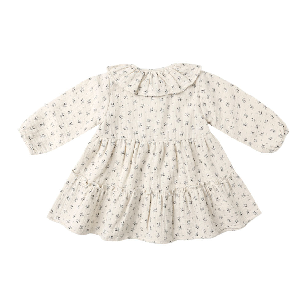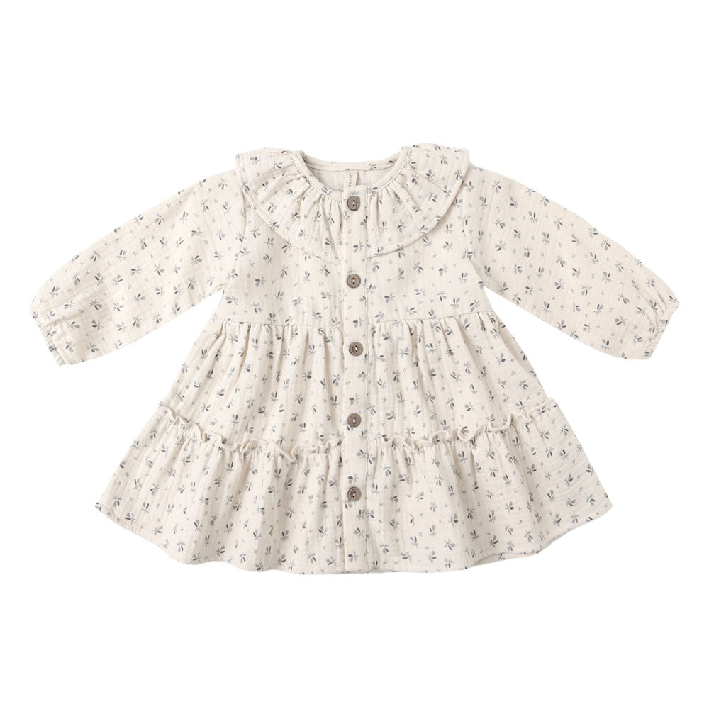 This tiered long sleeve dress features a sweet ruffle collar and button-down front for an effortlessly charming look. Coordinating bloomers included with sizes 0-3M - 2-3Y.
