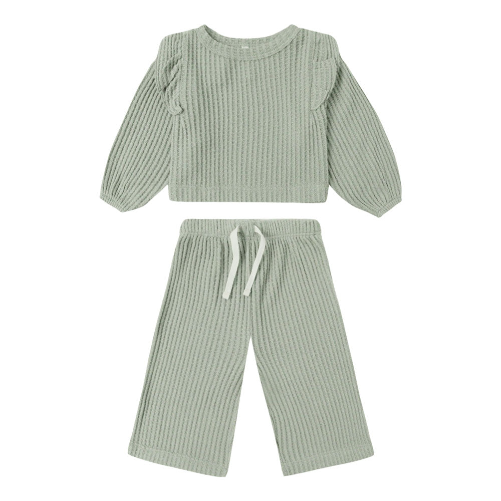 Made for cozy days, this darling set in Quincy Mae's fuzzy waffle knit includes a long sleeve top with ruffle shoulder detail and wide leg pants featuring an elastic waistband and fixed cotton drawstring.
